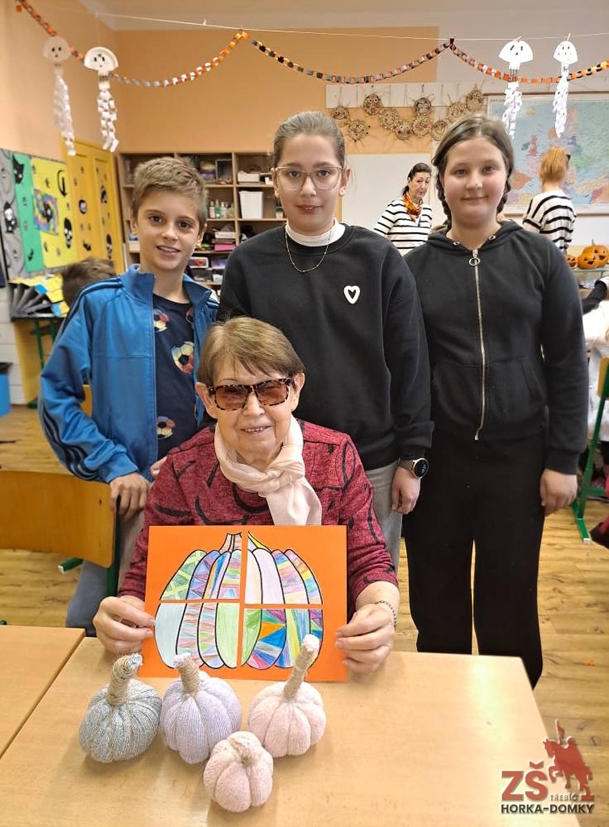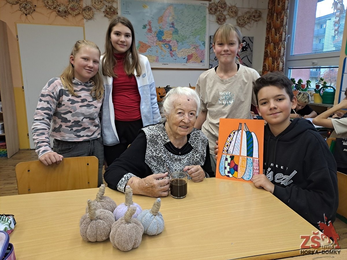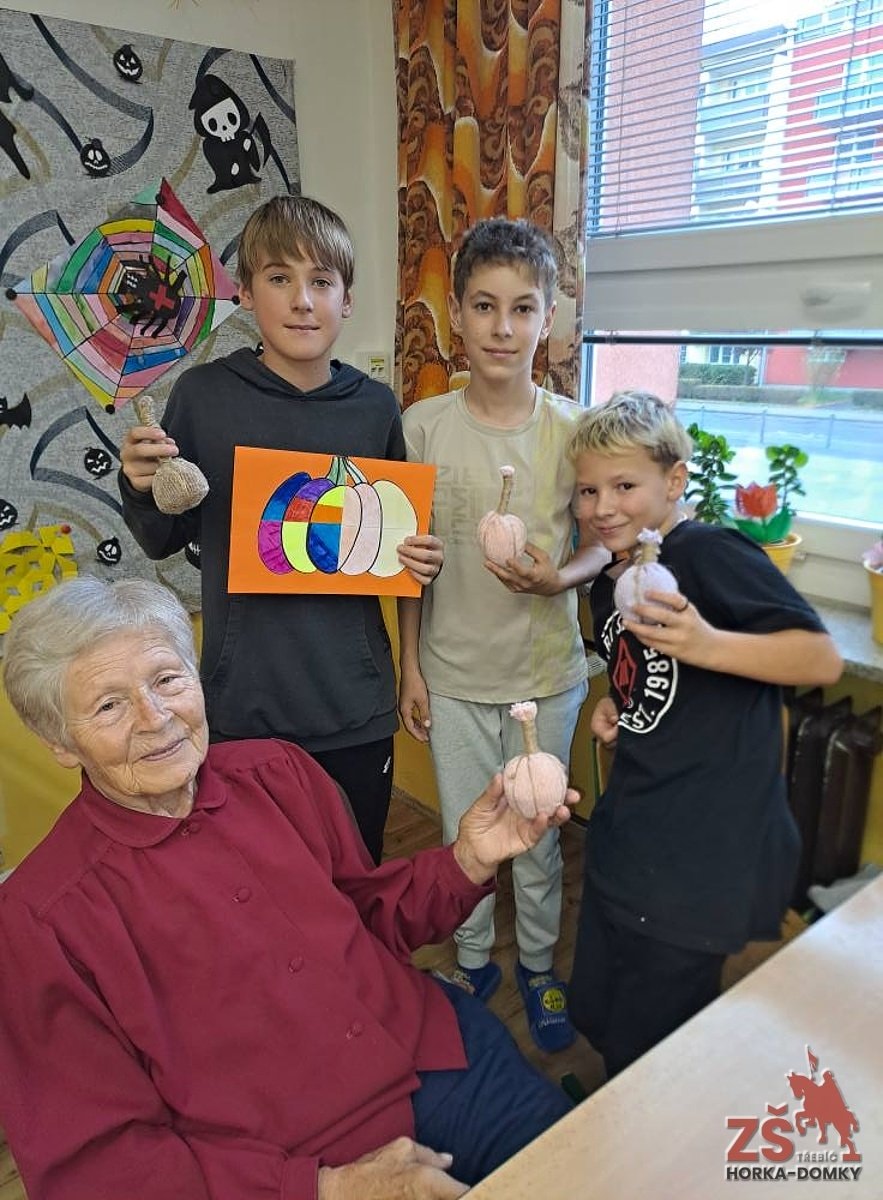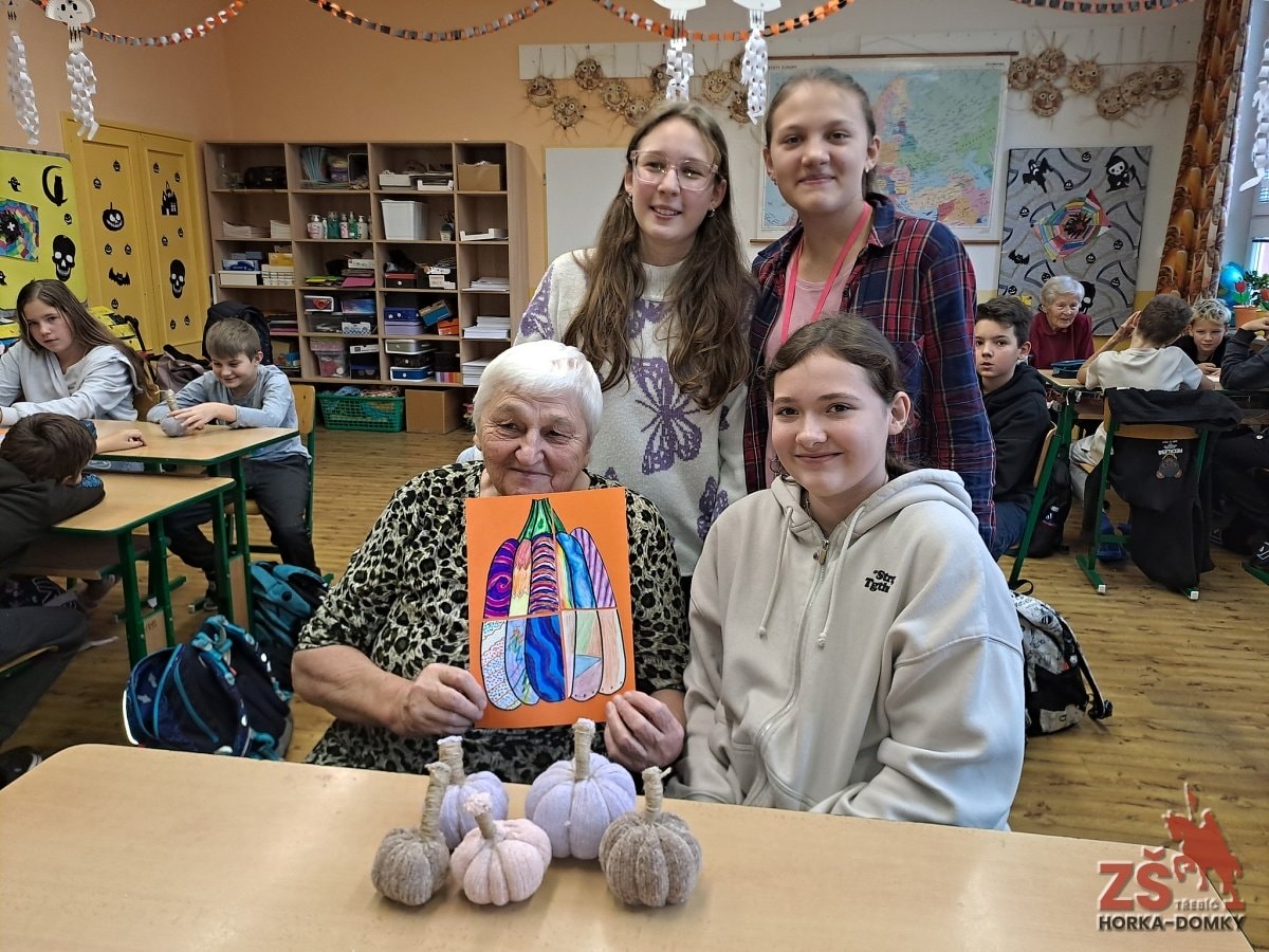 Na tradiční výtvarné setkání dorazila v druhé polovině října návštěva z Domova pro seniory Manž. Curieových. Nově se jejími hostiteli stali žáci 6. A. Společně tvořili textilní dekorace a obrázky dýní. Už teď se všichni těší na další společné chvíle mezigeneračního spojení.