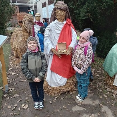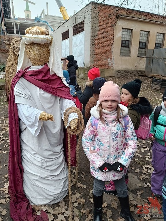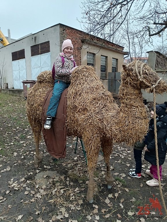 Slaměný betlém na farnosti Třebíč - Jejkov vytváří skupina dobrovolníků už několik let. Zároveň každoročně láká malé i velké návštěvníky na interaktivní program. Letos se adventního rozjímání zúčastnili žáci 1. C, 2. A a 2. C. Slaměné postavy v životní velkosti připomínaly příběh zrození Ježíše Krista. Dominantou a zároveň největším potěšením celé prohlídky byl obří velbloud, na jehož hřbet se mohly děti posadit. Farnost Jejkov slouží také jako potravinová sbírka, a tak žáci učinili mimořádně dobrý skutek, když při návštěvě přinesli trvanlivé potraviny pro ty, kteří to potřebují nejvíc.